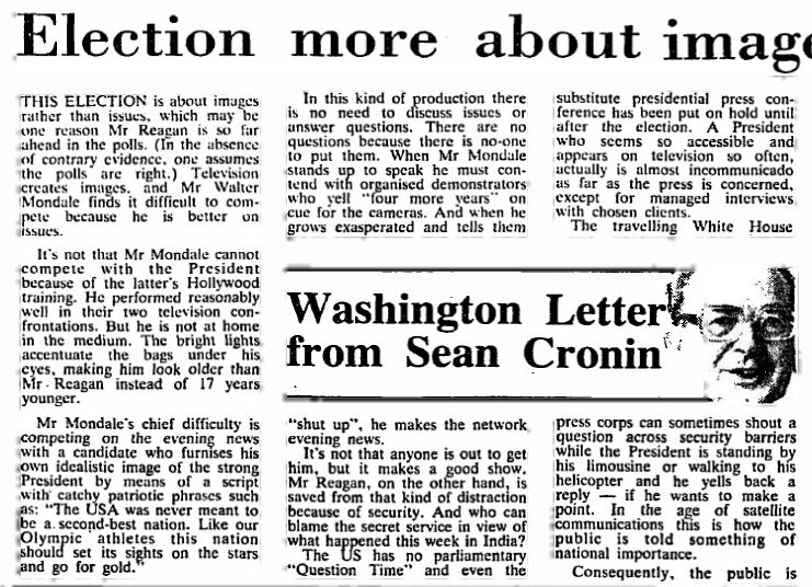 Sean Cronin sneers at Reagan's stunning 1984 re-election, Irish Times, November 3, 1984.