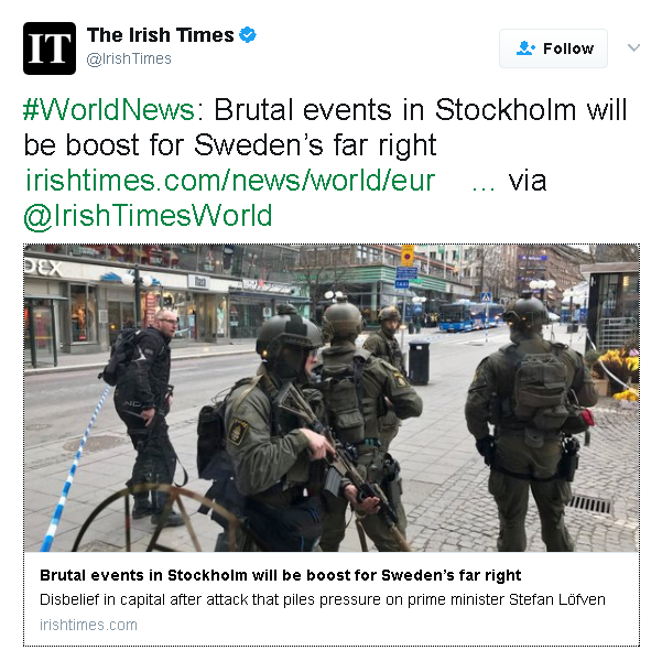 After a horrific jihad attack in Sweden, the Irish Times is worried that this will boost the fortunes of people who dislike jihad.