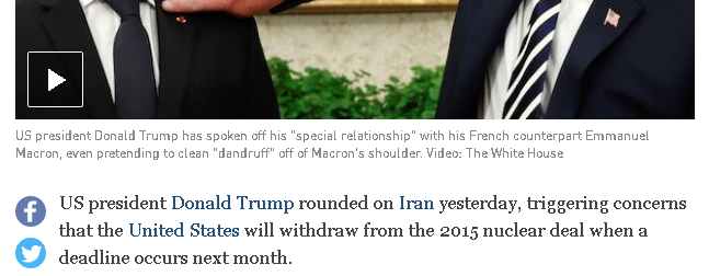 Irish Times front page, 25 Apr 2018, says Trump triggers "concerns" that the US will withdraw from the Iran nuclear deal.