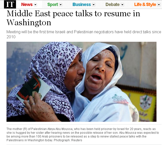 The Irish Times, 29 July 2013, illustrates a story about Israel releasing prisoners as if it is a good thing.