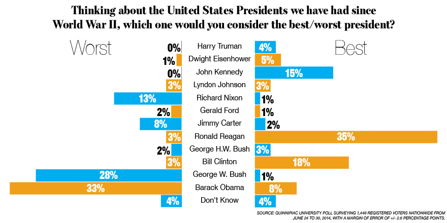 Poll of Americans, July 2014, finds they think Obama is the worst President since WW2, and Reagan is the best. I would agree on both counts.