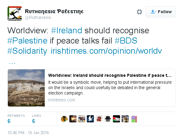 Holocaust denier "Ruthanasia" likes an Irish Times article on Israel by Paul Gillespie, Jan 2016.