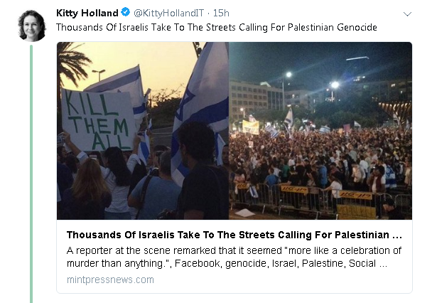 Irish Times journalist Kitty Holland promotes a fake news story about Israel from the fake news Mint Press website, July 2018. Mint Press have a photo of a sign at a Tel Aviv demo saying "Kill Them All" and says all these Israelis want genocide. Kitty Holland promotes that claim.