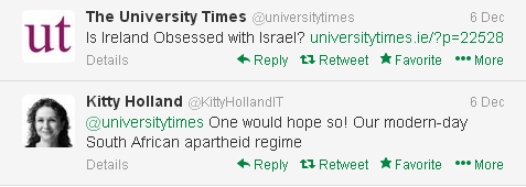 Kitty Holland calls the democracy of Israel an "apartheid regime", 6 Dec 2013.