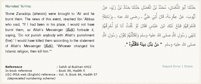 Some Zanadiqa (atheists) were brought to 'Ali and he burnt them. The news of this event, reached