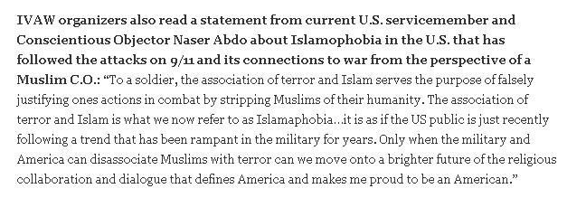 Iraq Veterans Against the War read a statement on "Islamophobia" from Naser Abdo at a press conference in 2010.
