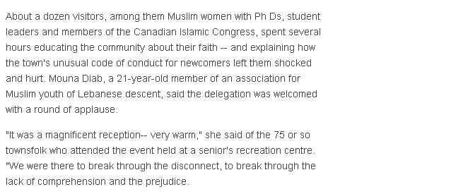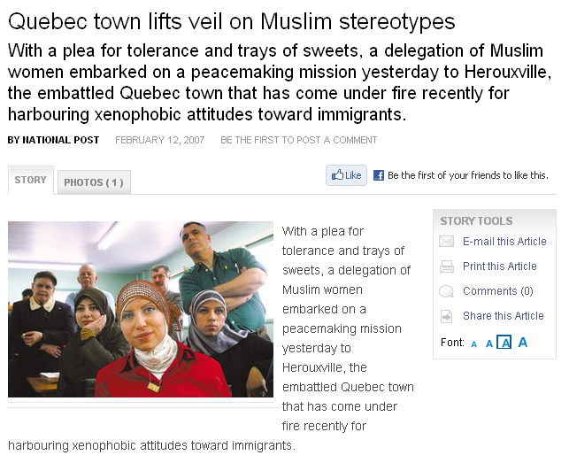 Quebec town lifts veil on Muslim stereotypes, National Post, Canada, 12 Feb 2007.