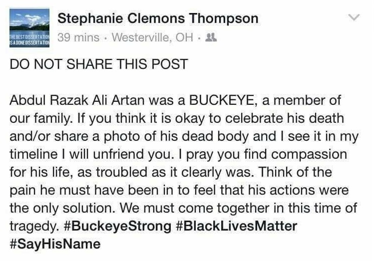 Loony left Ohio State University staff member Stephanie Clemons Thompson urges compassion for the cruel terrorist who tried to kill random students.