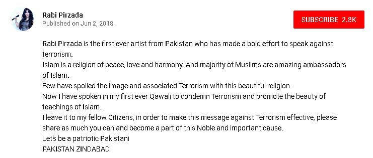 June 2018: Pakistani pop singer Rabi Pirzada bravely stands up against "terrorism".