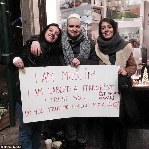 Muslim convert Craig Wallace holds a misspelled sign outside Parliament, Dec 2015, saying: "I am Muslim. I am labelled a terrorist. I trust you. Do you trust me enough for a hug?"