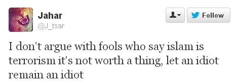 Jan 2013: American Muslim Dzhokhar Tsarnaev gets angry with people who link Islam to terrorism.