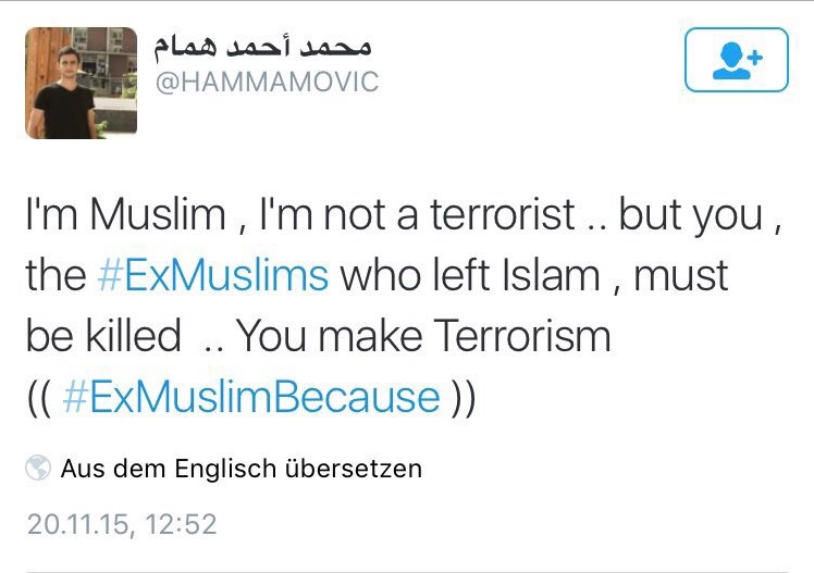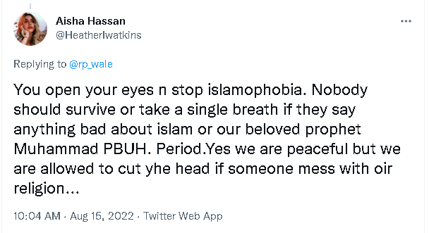 "Stop Islamophobia" and "everyone should fear our violence" and "we are peaceful" and "we will kill you" all in one tweet.