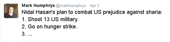 My reaction to the hilarious news in Apr 2017 that the Fort Hood mass murderer plans a hunger strike to protest America's "hatred" of sharia.