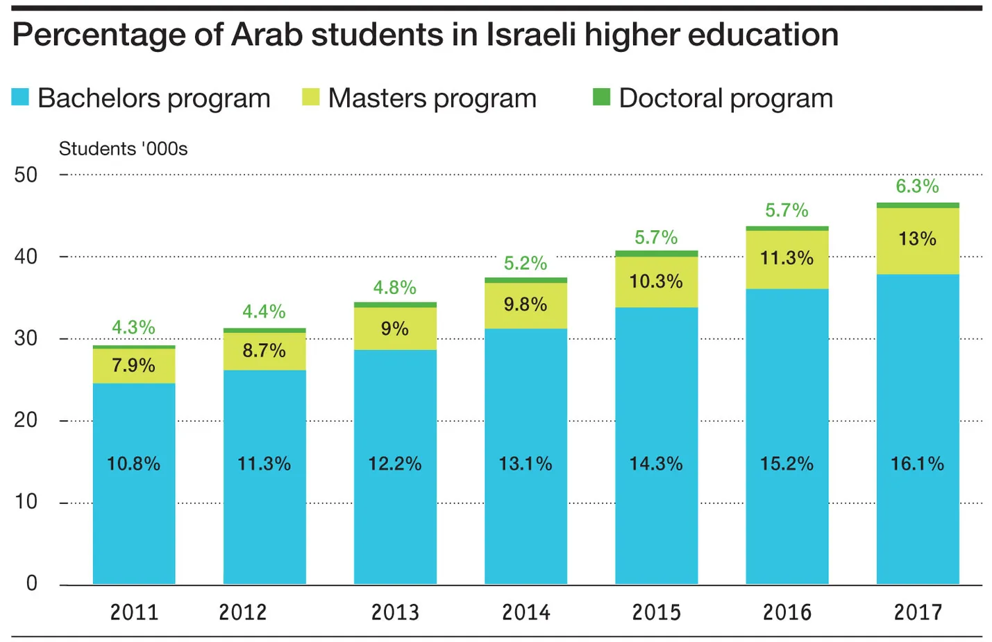 Arabs are 16 percent of undergrads in Israeli universities. (Arabs are 20 percent of population.)