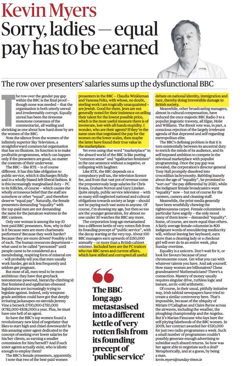 • This article started the entire 2017 hysteria. Myers was accused of anti-semitism over this article. After discussing the pay of BBC presenters, he mentioned two female presenters who are Jewish, and said: "Jews are not generally noted for their insistence on selling their talent for the lowest possible price".