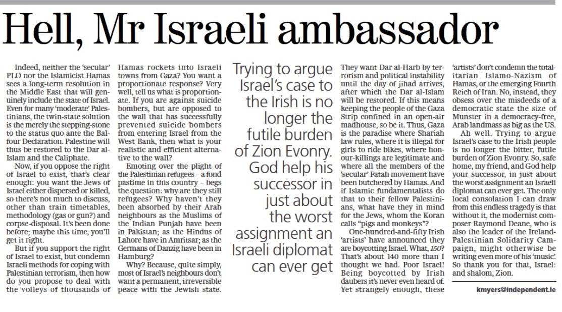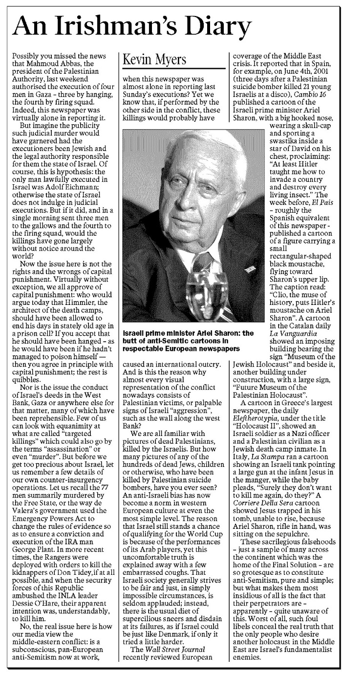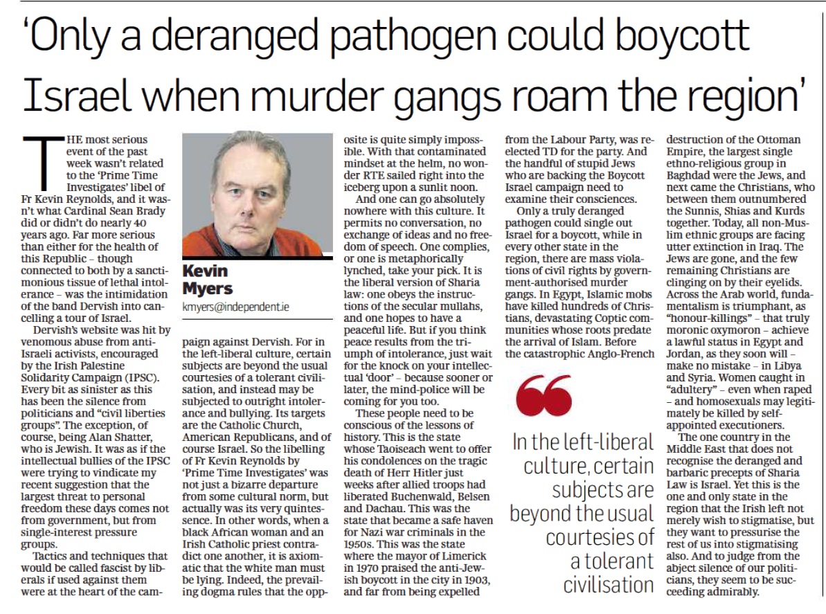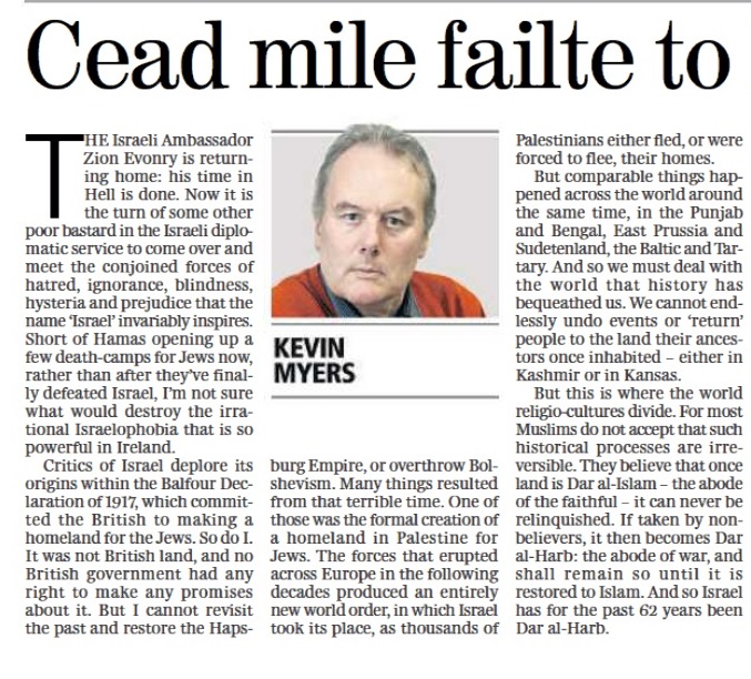 For decades, Kevin Myers has been: (a) one of the main critics of the IRA and Sinn Fein in Ireland, and: (b) one of the main defenders of Israel in Ireland. Unlike much of Ireland, he is pro-American, pro-British and pro-Israel. I like a lot of his work and link to him.