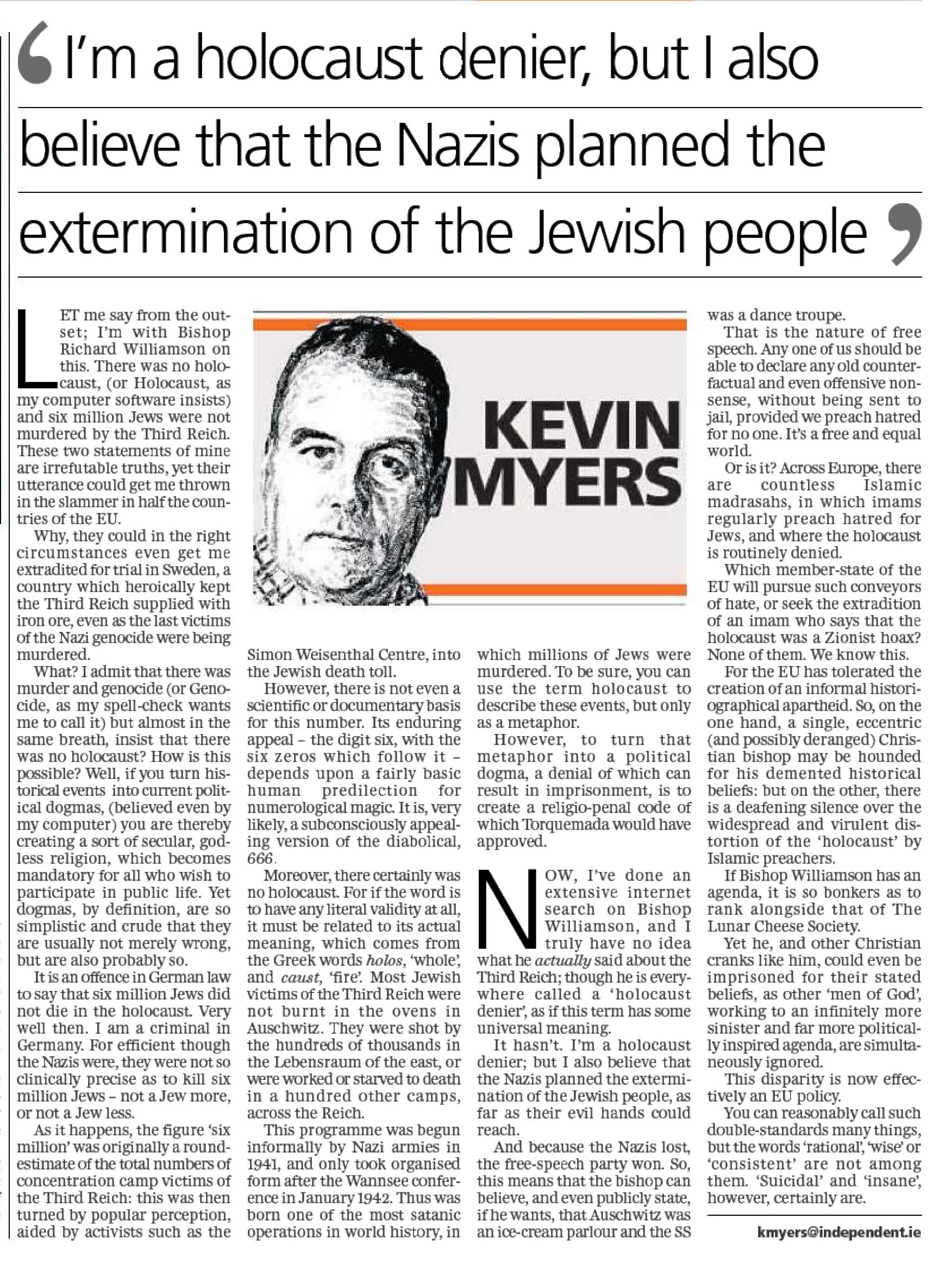• He wrote a better followup article, Irish Independent, 1 Apr 2009. (And search for text.) He makes the point about free speech more clearly here. He points out the difficulty of defining a Holocaust denial law precisely. What exactly can you not say? It is a good point, but made in an unnecessarily offensive way. Anyway, he is clearly not a Holocaust denier.
