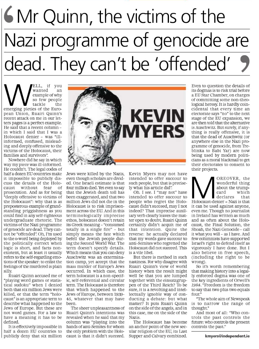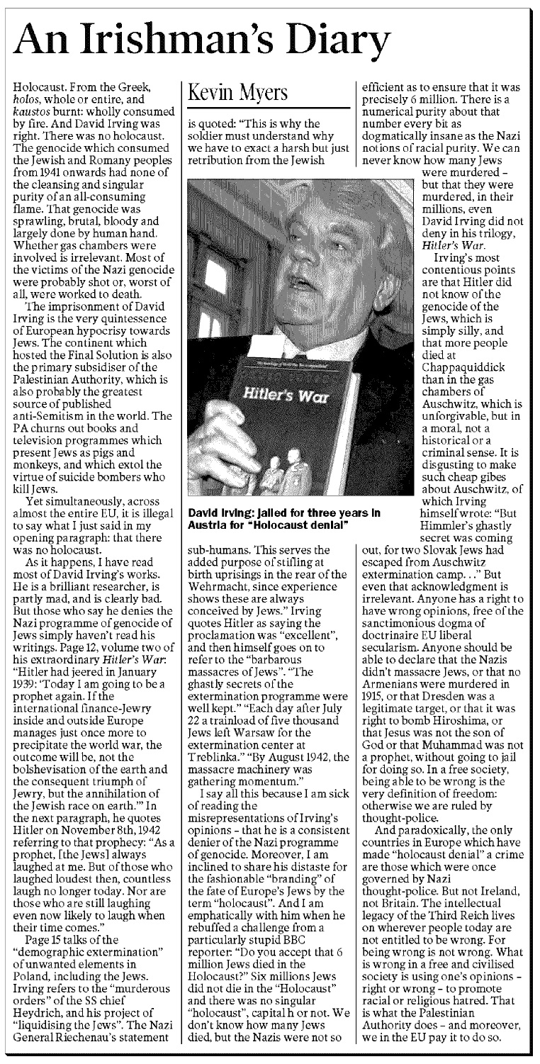 • He also wrote a previous terrible article in the Irish Times, 22 Feb 2006. (And search for text.) This opposes the jailing of David Irving for Holocaust denial. Again he uses shock, offensive language: "David Irving was right. There was no holocaust." However, the article itself goes on to show that the Holocaust happened and Irving is a Holocaust denier and Myers is not. So why start with such offensive wordplay?