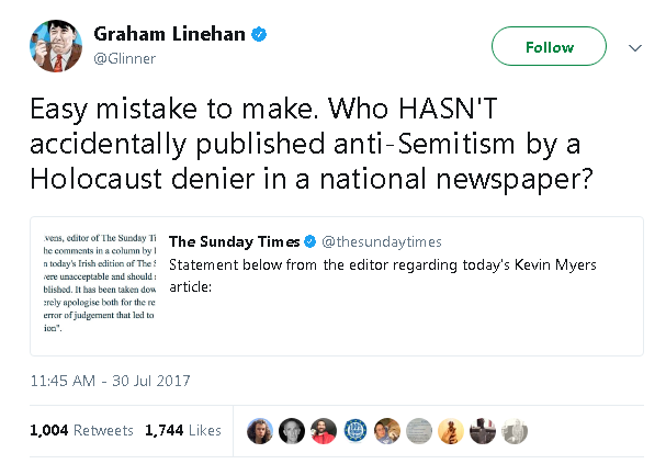 Comedy writer Graham Linehan in 2017 libels Kevin Myers as a "Holocaust denier".