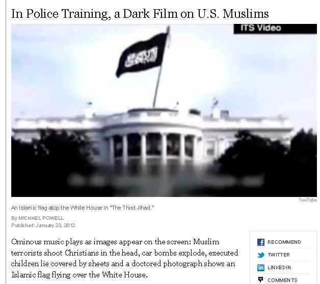This article of 23 Jan 2012 is shocked at an "Islamophobic" film showing the black flag of Islamic jihad flying over the White House.