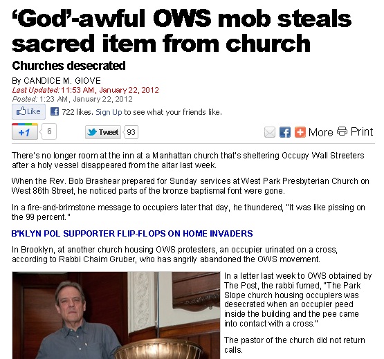 Of course the Occupy people appreciate this: "parts of the bronze baptismal font were gone ... an occupier peed inside the building ... an occupier urinated on a cross ... a $2,400 Apple MacBook vanished from [the cleric's] office."