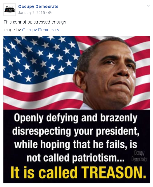 Jan 2015: "Occupy Democrats" says that "disrespecting" President Obama is "treason".