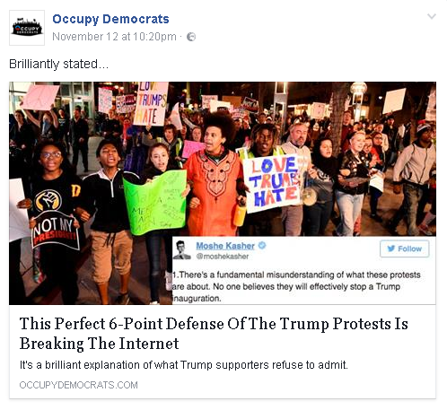 Nov 2016: "Occupy Democrats" supports the protests against the election of President Trump.