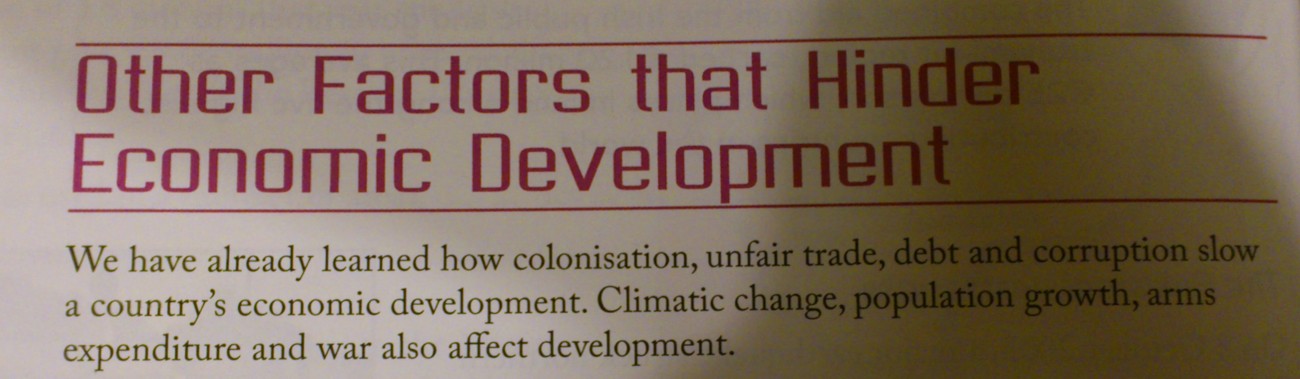 colonisation, unfair trade, debt, corruption, climate change, population growth, arms expenditure and war.