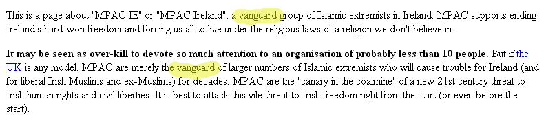 EireMuslim was a nasty anti-Israel, anti-gay, anti-Copt, pro-sharia, pro-Wahhabi, pro-Saudi site. Like MPAC, it was a tour of everything that is wrong with Islam.