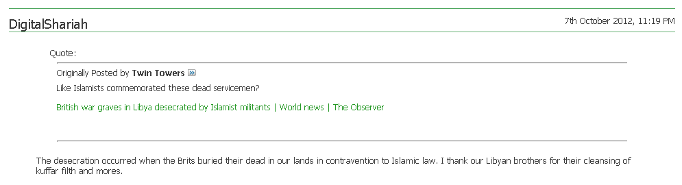Liam Egan, 7 Oct 2012, supports the desecration of the graves of British war dead.