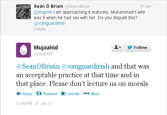 Liam Egan, Jan 2013, defends Mohammed taking a 9 year old girl as a wife.