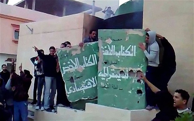 Rebels destroy a monument to Gaddafi's "Green Book", Eastern Libya, Feb 2011.