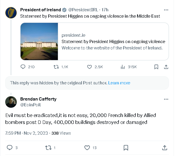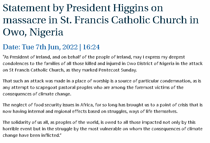 "What the President of Ireland says about killings in Nigeria will not, of course, matter a whit to the dead, or to their families. On the global scale, he is a fantastically unimportant man. But he is, for some reason, our chosen representative as a people. What he says is notable, and why he says it is worth exploring. If for no other reason than that we might hope, and pray, that the Irish electorate in time comes to learn from its error, and doesn't replace this fool with one of like mind."