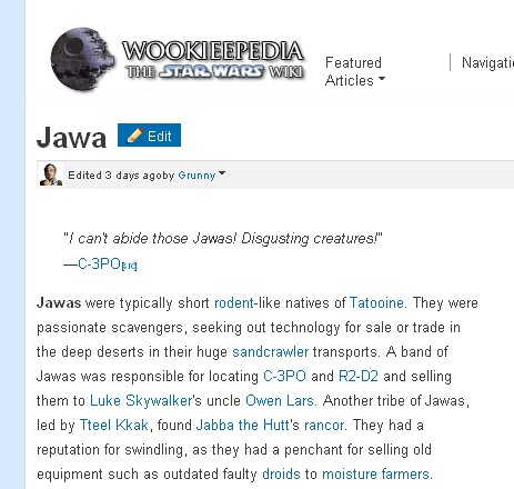 so he Googles it, finds a hostile claim that it is a "weblog comparing Muslims to Jawas",