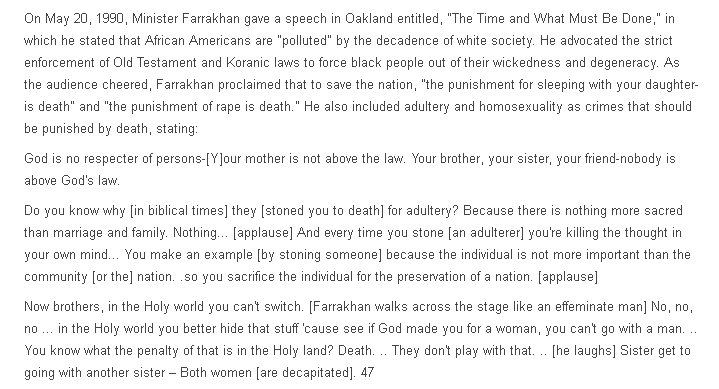 "[The white man] owes you anything you want, even his life. All the stores will open if you say the magic words. The magic words are: Up against the wall mother fucker this is a stick up! ... Let's get together and kill him my man.""Rape the white girls. Rape their fathers. Cut the mothers' throats.""We [blacks] must eliminate the white man before we can draw a free breath on this planet".