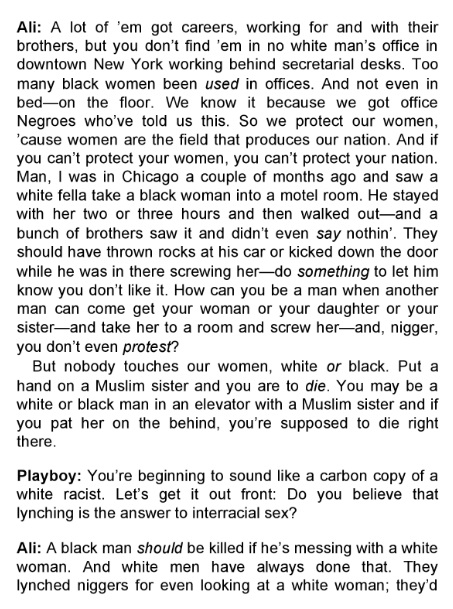 he declared: "A black man should be killed if he's messing with a white woman." When the interviewer asked about black women crossing the colour barrier, Ali responded: "Then she dies. Kill her, too.""
