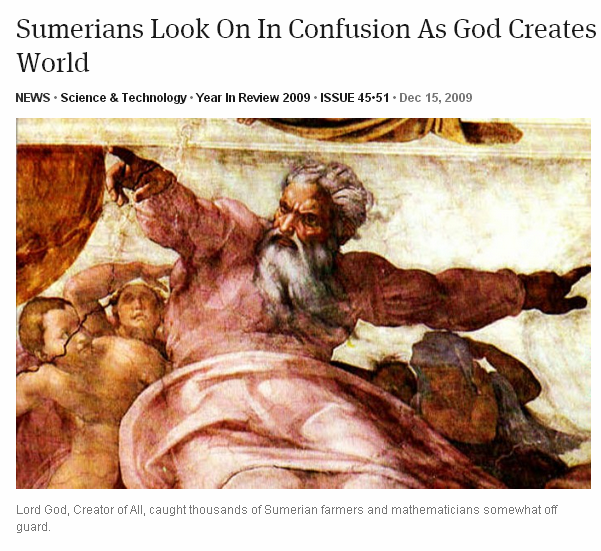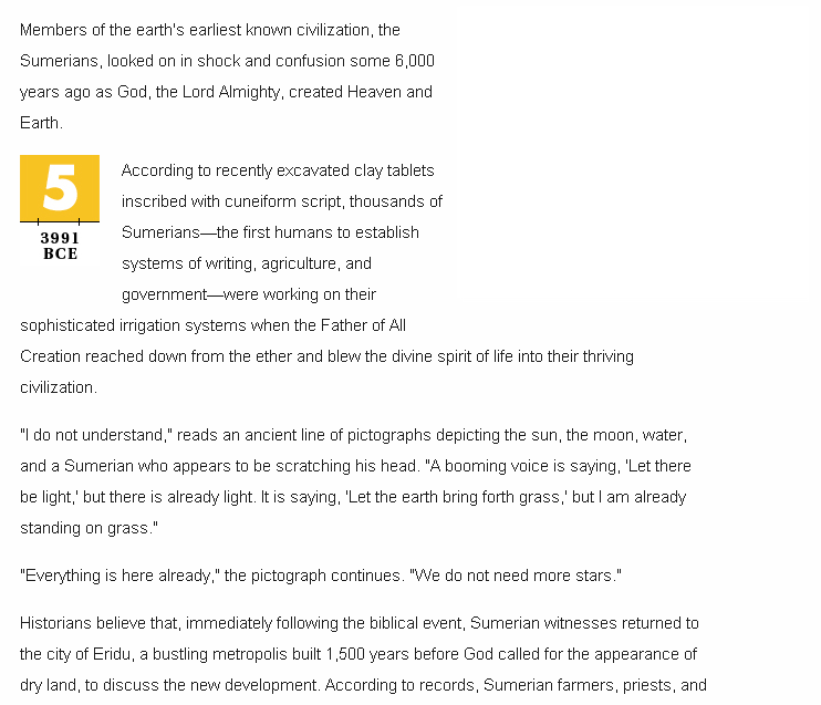 "The Sumerian people must have found God's making of heaven and earth in the middle of their well-established society to be more of an annoyance than anything else."