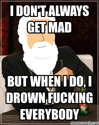 In revenge for alleged sins committed by some adults, God drowns millions of innocent babies, toddlers and children. He is the greatest abortionist ever. He is the worst child killer ever. The children drown in terror, screaming for their mothers and fathers, all because of the anger of this evil cosmic bastard. If a God like that existed, I would not worship him. I would try to kill him.