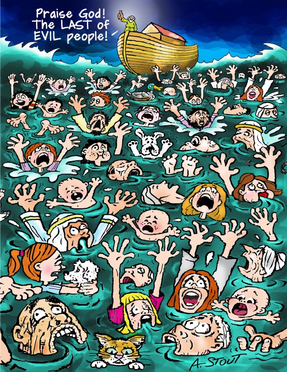 It is little comfort that no such God exists in reality and the Flood never happened. The fact is, this story is in the Bible and we are meant to admire the God that did it.