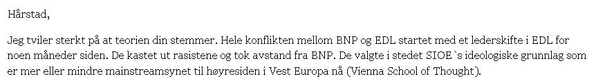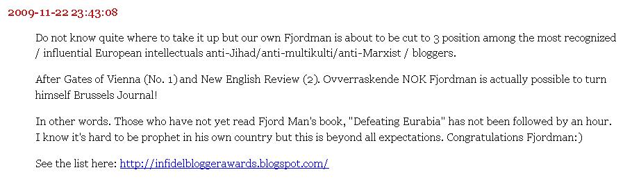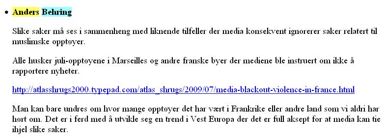 "It is ridiculous to conduct a witch hunt on Fjordman. He is against violence and for democracy."