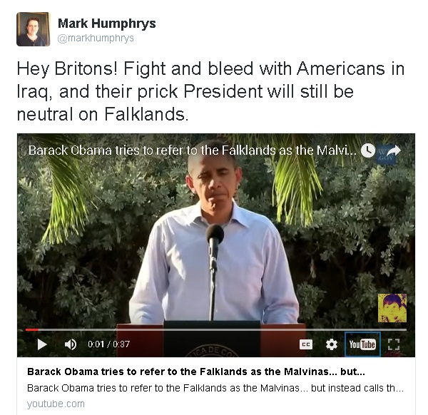 Guido Fawkes blogger Harry Cole calls President Obama "both a hypocrite and a coward" for refusing to back the people of the Falkland Islands.