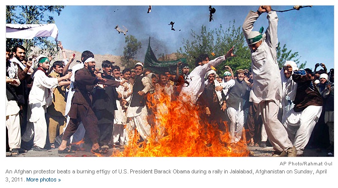Despite Obama's dhimmitude, a crazed Islamic mob in Afghanistan in Apr 2011 is unimpressed.