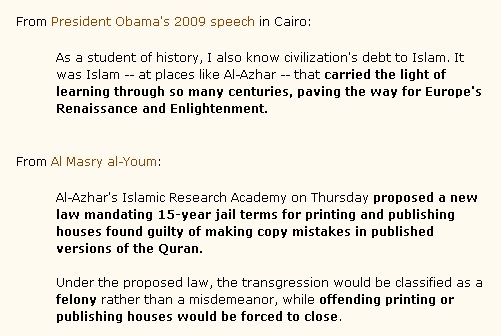 Idiotic President Obama opened his June 2009 speech by praising Al-Azhar University: "I am honored to be in the timeless city of Cairo, and to be hosted by two remarkable institutions. For over a thousand years, Al-Azhar has stood as a beacon of Islamic learning ..."