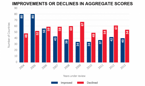 Freedom House 2014 report shows countries improving and declining in their freedom ratings each year.
