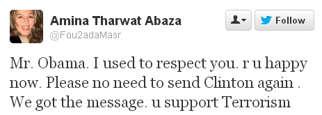 A sad Egyptian tweets on 5 Dec 2012 about the apparent support of Obama and Clinton for the oppression of secular Egyptians.