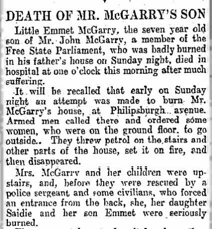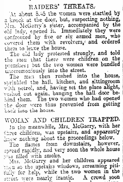 In the Civil War in Dec 1922, the anti-Treaty IRA set fire to the home of pro-Treaty TD Seán McGarry while his children were asleep in it, and closed the front door to prevent rescue.