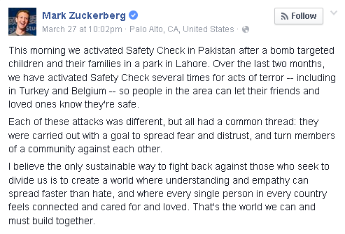 Absurd post by Facebook inventor Mark Zuckerberg, 27 Mar 2016, after the jihad massacres in Brussels and Lahore.