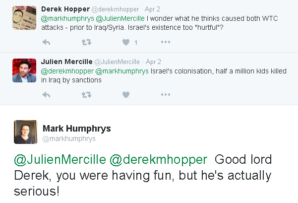Irish academic Julien Mercille, 2 Apr 2016, says the root cause of 9/11 is Israel, and sanctions on Iraq.