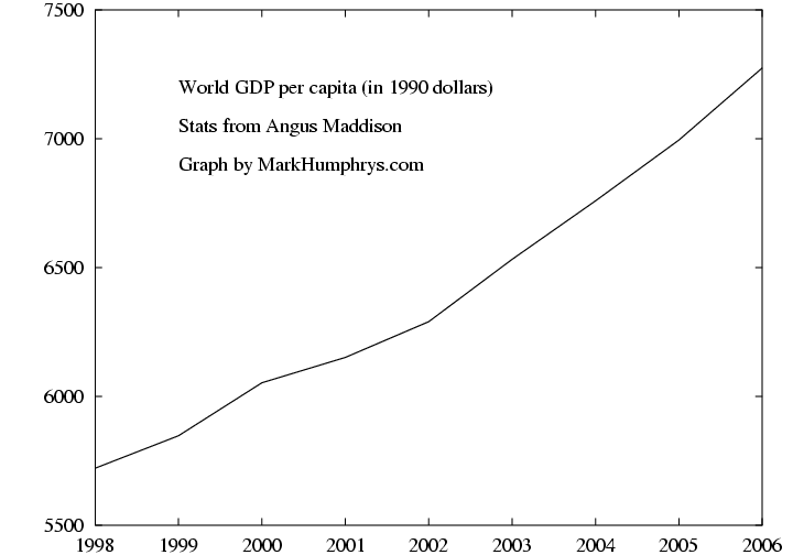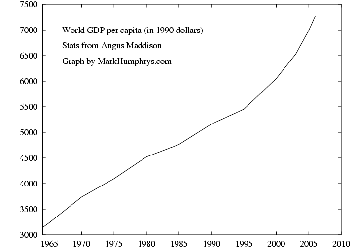 World GDP per capita (in 1990 dollars). It keeps increasing.