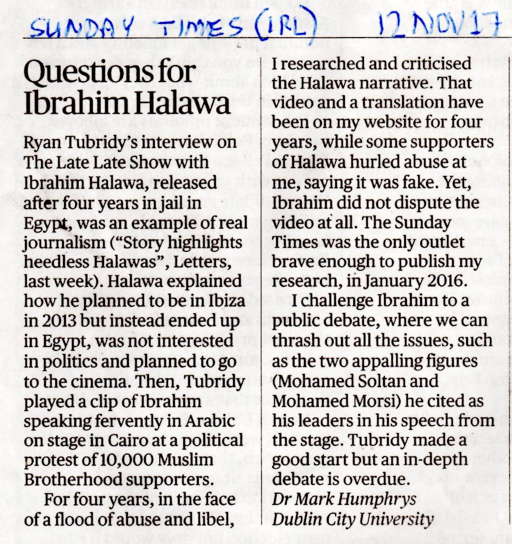 Well, it came from my research. For four years, in the face of an endless flood of abuse and libel, I have researched and criticised the Halawa narrative. I worked hard to source original material from multiple countries. I was tipped off to the video by an Egyptian contact. It was posted online by Ibrahim's sister. She deleted it, but I had saved it. I then got my Egyptian contact to translate the Arabic for me. The video and translation have been on my site for four years, while Halawa supporters hurled abuse at me, saying that both video and translation are fake. (The Halawas themselves have not been abusive. It is their defenders.)